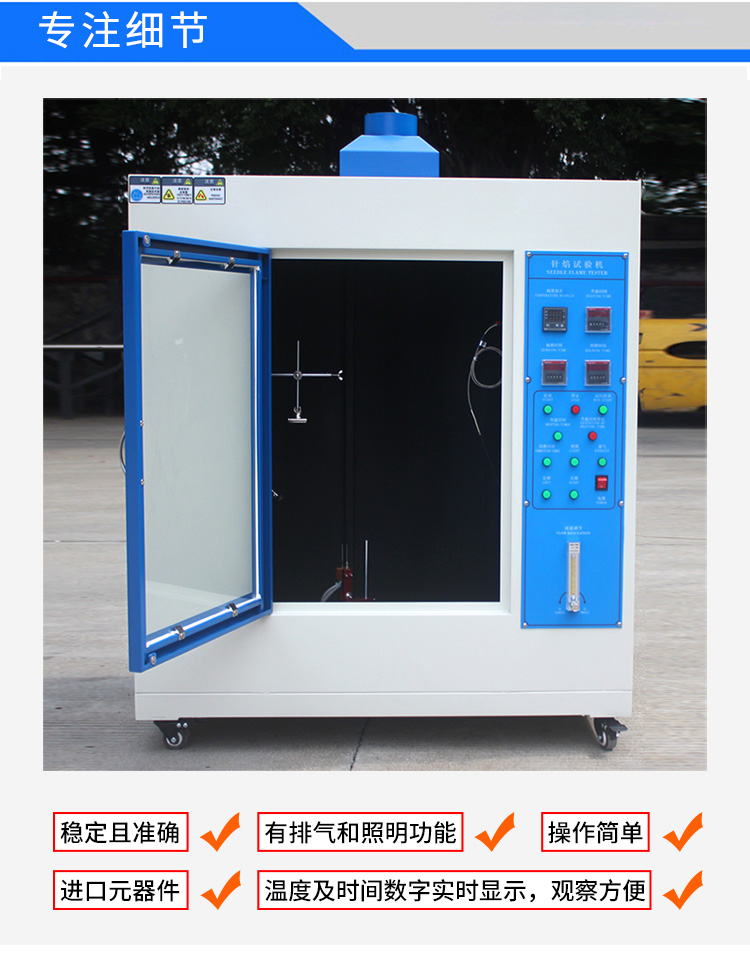 针焰试验仪是用规定尺寸(Φ0.9mm )的针状燃烧器,通以特定燃气(丁烷),以 45°角定时定向施燃试品,视试品是否引燃及持燃时间和燃烧长度来评定设备内部因故障条件造成的小火焰的着火危险性。